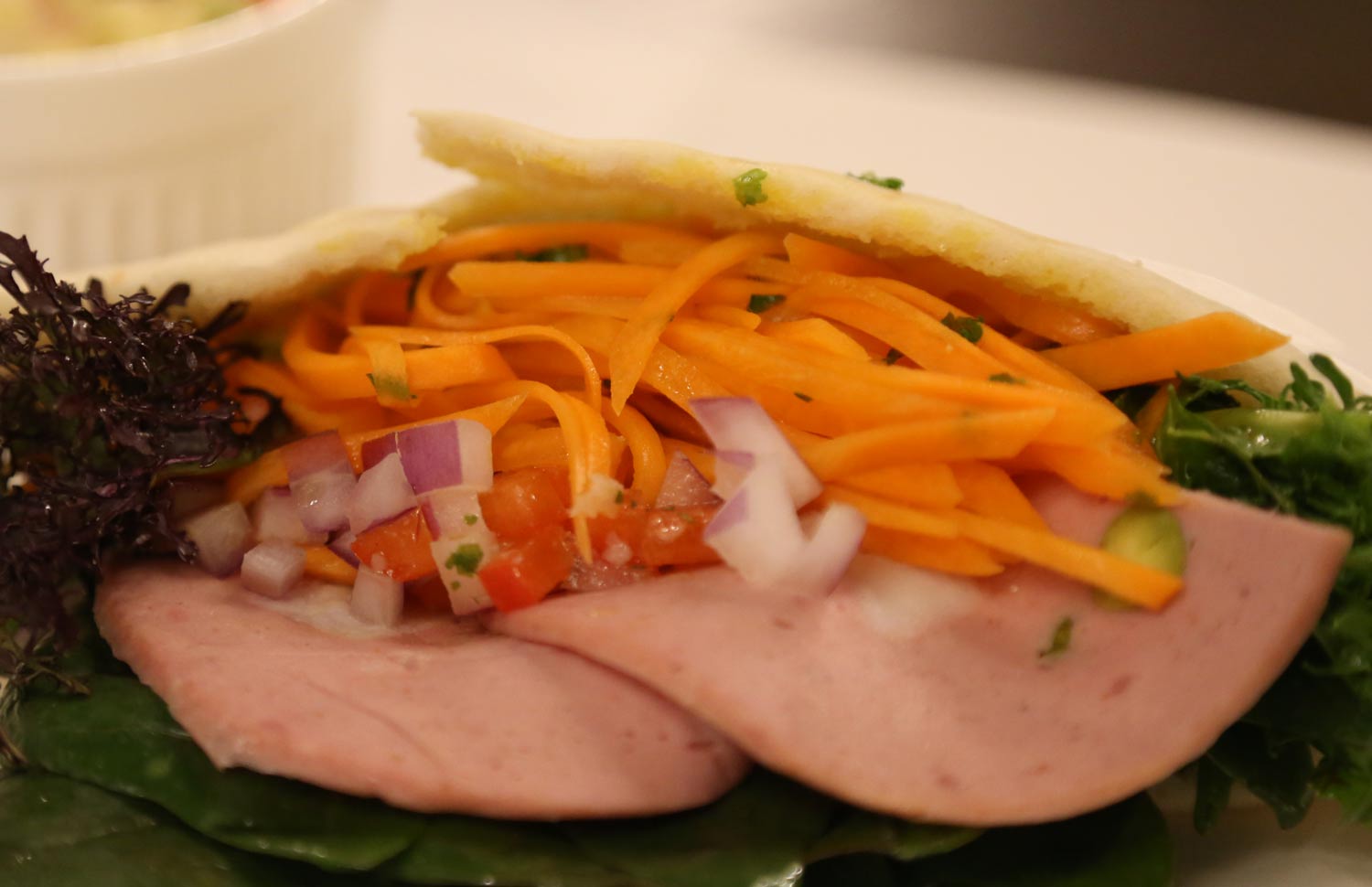 野菜農家からは「新鮮な野菜は、シンプルに生で食べてもおいしいよ」と教えてもらった。生のニンジンにオリーブオイルと塩をあえただけの「ニンジンのラぺ」。ピタパンにハムではさんでみました。良い香りでホントにおいしかった!