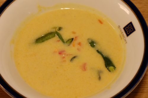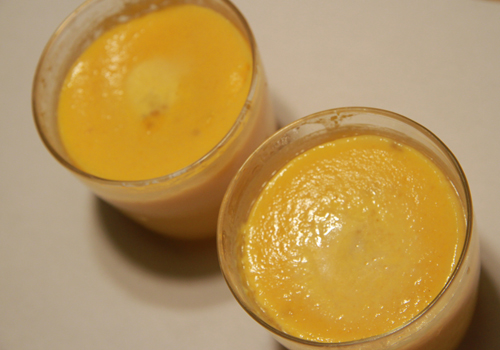 Dscf0573_2半分に割ってみると、中は外皮より濃い目のオレンジ色。種は下の部分に集まっています。見ただけでわくわくします。このクリーミーさは、ポタージュかプリン向き、と言われて、作ってみました。