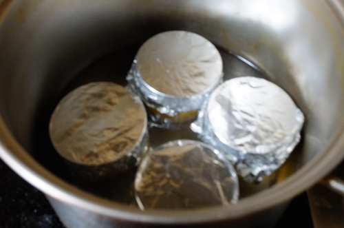 5. Dscf0580プリン用のカップに移し、蒸し器(わたしは鍋を使ったが)などで固まるまで蒸す。