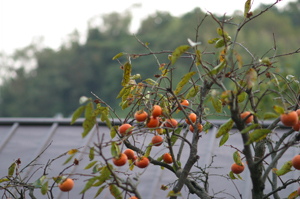 青い空をバックに凛とした渋い瓦屋根、その男性的な風景をホンわりと優しい雰囲気にする柿の木。そう、実をたわわにつけた柿の木に私たちの心は引きつけられてしまったのです。