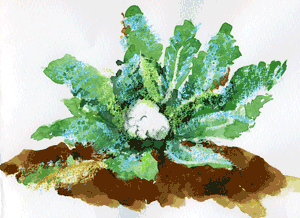 キャベツより少々長い、まかない葉に幾重にも囲まれて、その中心にカリフラワーは実る。ひとつの株にひとつだけ。ものすごく大切にされ、ひっそりと咲くお花。だから真っ白。出荷される時は周りの葉はみんな捨てられてしまう(食べようとすれば食べられるのだけど)。ブロッコリのように取っても脇から生えてくる、なんてこともない。カリフラワーはとても贅沢でありがたいやさい。鎌倉の畑に咲く、夢のように白い花。