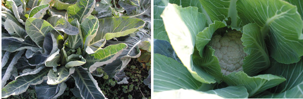 温室近くの畑では、不思議なやさいを発見。キャベツの葉っぱが巻いていない。いや、キャベツのようだが、どうも葉が長いぞ。 これも観賞用の新種の植物だろうか? 恐る恐る中心と思われるところをほじると、なんと、真っ白いモコモコ。こ・・・これは、カリフラワー!