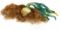 発芽に必要なエネルギーを確保するため、土を暖める役割のあるこのビニールを使うのだとか。ひとたびビニールの穴から発芽すると、芽は寒さや暖かさにさらされて育つ。この気温の差が甘さを引き出すのだ。このころにはビニールは取っても良いのだけど、基本的には畑を覆ったままなのだそうな。水分はどこから?と聞いたら、土がもともと持っている水分を根っこが吸うので、ビニールに覆われたままでも、水をまかなくても充分育つんだって(根っこってスゴイ!)。数ヶ月すると葉の成長が止まり、養分は根に蓄えられていく。それがたまねぎになり、土の中で育って丸々としていく。そうして約半年。葉が倒れる初夏には収穫だ。
