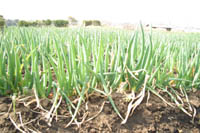 山森さんの畑には、びっしりと たまねぎの茎が見える。ちょっと混んでいません
