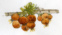 たまねぎは貯蔵もきくから、初夏の農家の軒先でさおに掛けて日 陰干しをする懐かしい光景も、この地域ではよく見かける。農家の人にいつくしんで作られたたまねぎは、なんだか彫刻のように美しかった。(Can)