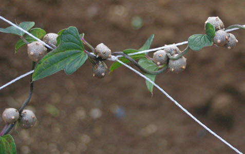 「やや、昨日はこんなものなかったのに、今日になったら花の根元に何かついてる」自然薯の前に立った佐藤さんが言う。自然薯の花は、小さなゴマの実のようなぷつぷつが集まって咲いて、ちょっと上向き気味の小さなぶどうの房みたいな三角錐(さんかくすい)。その房の茎よりの部分に、ちゃいろい実のようなものが…。「自然薯の実なら、むかご。でもこんなにたくさんなるんだろうか?それにあれは秋11月ごろなるような・・・」