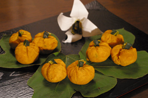 Img_4204 「来客の多いお盆のころ、この地域ではよく食べたのよ。」と三浦さんが作ってくれたのは小さくてキュートなかぼちゃたちの料理。小口に切って煮て柔らかくなったかぼちゃにダシと醤油と砂糖で味付け。直径4㎝ほどの茶金絞りにして形を整え、皮で軸部分を表現。皮を煮すぎないのがコツだとか。葛の葉の上にコロンと乗るカボチャの周りに家族が集まる姿が見えるようで、料理は甘くて懐かしい味がした。Kabo2