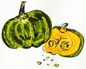 そういえば夏休み、畑で見かけたカボチャも力強くて愛らしかった。日光を受けて大きく広がる無数の葉、どんどん伸びる蔓、黄色いラッパのような花、深い緑色の外見に、中は鮮やかなオレンジ。戦国時代カンボジア経由で日本に伝えられ、カンボジアがなまって、かぼちゃになったのだとか。ユーモラスな名前がぴったり。Img_4261