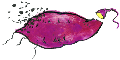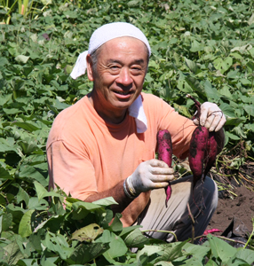 広くて高い秋の空のもと、 青々とした葉が繁るさつまいも畑。がっしりした背中をちょっとかがめながら、丁寧に手早く福田さんが芋を掘り出す。鮮やかな赤紫できめ細かい肌の「紅あずま」と「紅いも」が現れた。鎌倉では食用の主流。そのつややかさを見て福田さんの顔から笑みがこぼれた。今年の出来も良いらしい。