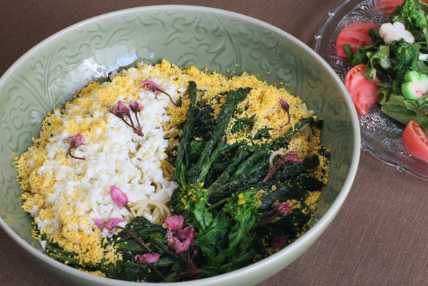 菜の花をフライパンでさっとあぶってからガーリックとタカのつめで味付けたパスタ。隣はおふと菜の花のサラダ、ゆず胡椒の和風ドレッシング。