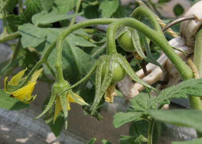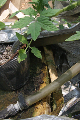 「トマトも見てよ」のお誘いに乗ってお邪魔したのは隣のハウス。何やら水路の上に厚いスポンジ状のものがあり、ちょこんと乗った鉢からトマトの苗が伸びている。このロックウールというスポンジの一種は、花屋さんでブーケをさす時見かける。パイプからそこへ水が直接流れ、とどまることがない。ここは鎌倉で唯一のロックウール水耕栽培ハウスなのだ。