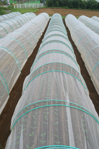 「3時を過ぎると涼しくなってきたので、ようやく葉物を植えるのには良くなってきたんだよ。そこにあるパオパオの畝は小松菜とカブの苗。植えて10日ほどだよ」猛暑の間、苗を植えても、暑さと少雨で、うまく育たないことが多かったと言う。苗はかわいらしいベビーリーフをつけて、パオパオの中で順調に育ちだした。