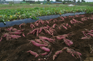 「いやあ、夏の猛暑と少雨で、サツマイモが地中深めに実ってね。掘り出すのが大変だった~!!」変わらぬ笑顔で迎えてくれたのは柏木さん。掘りたての色鮮やかで立派なイモが見える。夏の間、その根っこは水を求めて、深く深くに伸びていき、深さの先にイモが実ったのだ。そのケナゲさが、なんだか切ない。でも収穫の時期になって質も量も例年と同じかそれ以上であることは、笑顔が物語っている。