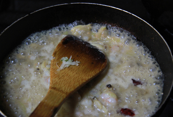 2)ガーリック、たっぷりのオリーブオイル、鷹の爪にシーフードミックスを入れ炒めます。場合のよってはシメジやエリンギなどのキノコ類も。隠し味にちょっとだけアンチョビ。
