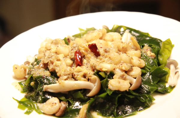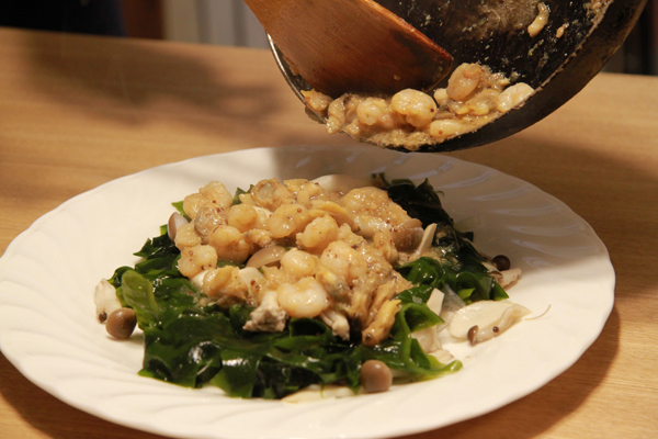 3)ワカメを皿に盛り、炒めたシーフード&煮汁を上からジュッ!とかけて出来上がり。