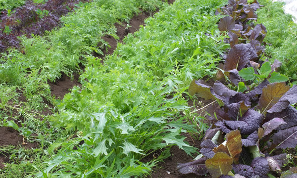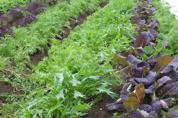 昨日まで初夏らしい素晴らしい天気!、と思っていたが、今日は午後から豪雨。オドロキ~。雨が降り出すちょっと前の畑。葉マスタード、水菜、わさび菜が育っています。