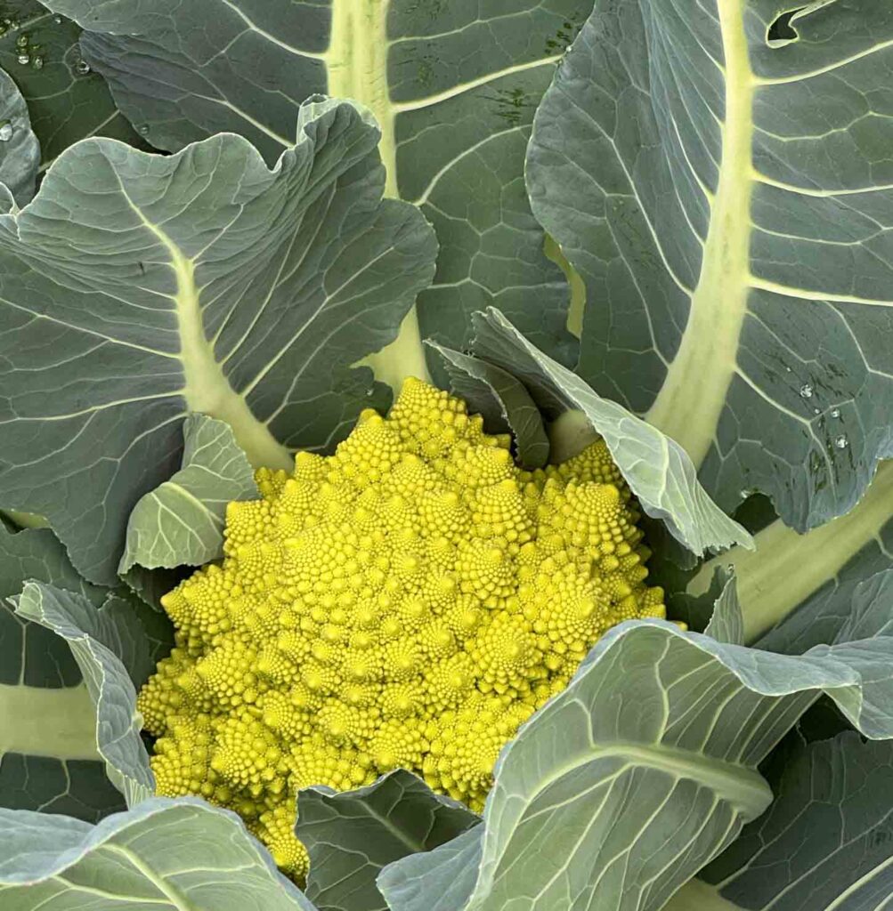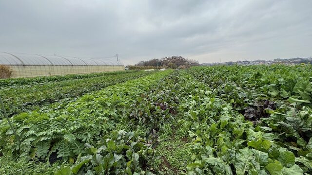 冬の畑 畑の様子 2025年12月29日2025年12月31日 先週畑に行ってきました。急に寒くなったこの日、野菜たちがしげしげと。 この寒暖の差によって、野菜は葉にでんぷんを蓄える。だから葉は夏の何倍も厚くなり、甘くおいしくなるのだそう。 冬はホウレン草や水菜、からし菜をよく見かけます。ダイコンやカブもこの季節、とても大きくなっています。 こちらはロマネスコ。カリフラワーの一種だから真ん中に一つ実がなります。キャベツのような葉は、実を取り囲むけど巻かないのです。まだ小さめだけど、きれい。 野菜たちが育っている鎌倉の畑です。